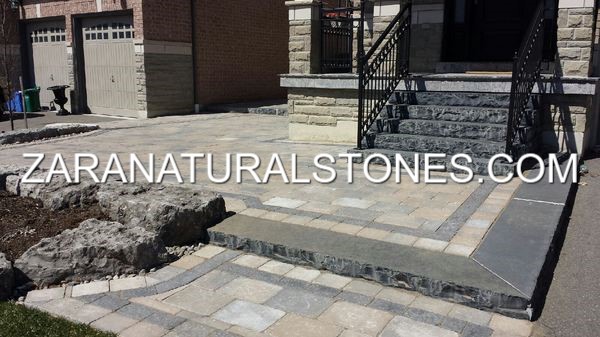 Zara Kota Black Natural Stone Step has a natural hand split surface with a hand chiseled profile edge which is dressed to a rockface finish that is highly desirable when designing a modern look. The back of this dimensional step is machine cut sawn. Zara Kota Black outdoor step perfectly complements any brand of retaining wall, interlocking concrete pavers or natural stone pavers. Kota Black limestone step combines aesthetic appeal with durability and can be used for entrance for homes or commercial buildings, backyard entrance, up hill walkways, incline pathways, decline grade changes or elevated patios.