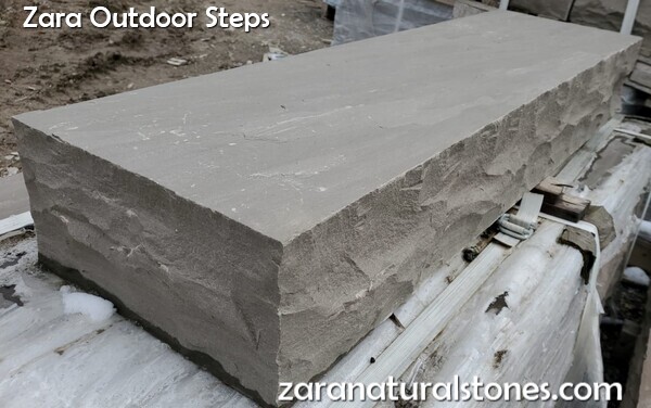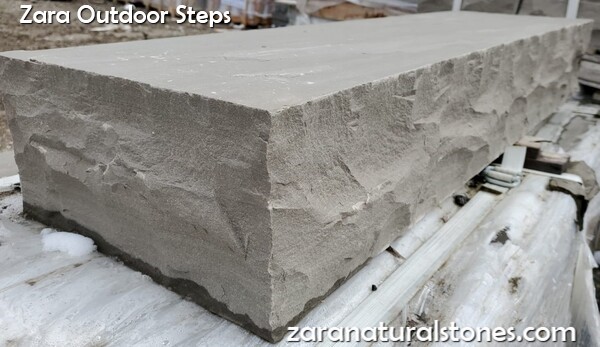 Zara Slate Grey Natural Stone Step has a natural hand split surface with a hand chiseled profile edge which is dressed to a rockface finish that is highly desirable when designing a modern look. The back of this dimensional step is machine cut sawn. Zara Slate Grey outdoor step perfectly complements any brand of retaining wall, interlocking concrete pavers or natural stone pavers. Slate Grey Sandstone step combines aesthetic appeal with durability and can be used for entrance for homes or commercial buildings, backyard entrance, up hill walkways, incline pathways, decline grade changes or elevated patios.